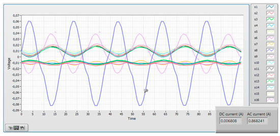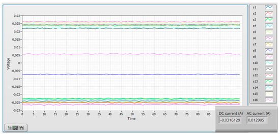 The software allows to register the reading of every individual sensor which is important for the transducer diagnostics. Figure 13 shows such record for zero measured current: the DC level of the individual sensors is given mainly by the Earth’s field component in its sensing direction. The slow sensor drift shows good long-term offset stability. Figure 14 shows the time record of individual sensors in the noisy environment: the total current reading shows how the external interference is effectively suppressed.