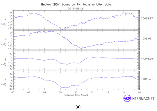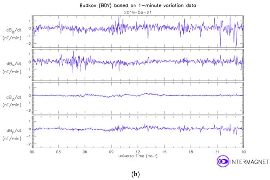 Variation of the Earth’s magnetic field measured at the nearest magnetic observatory variation station Budkov on 21 June 2019: (a) x (North), x (West) and z (vertical) components, (b) the rate of change. http://www.intermagnet.org.