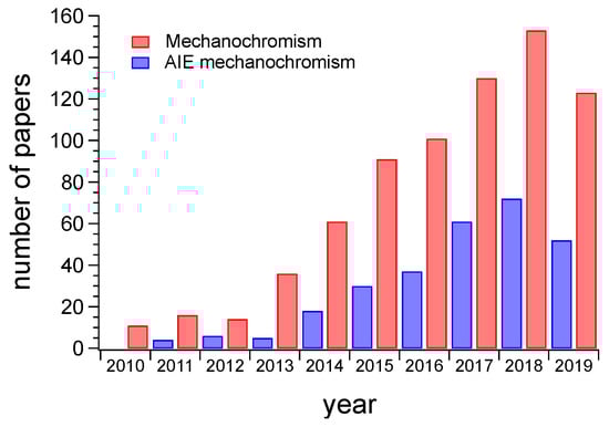 - Chi, Z.; Zhang, X.; Xu, B.; Zhou, X.; Ma, C.; Zhang, Y.; Liu, S.; Xu, J. Recent advances in organic mechanofluorochromic materials. Chem. Soc. Rev. 2012, 41, 3878–3896. [Google Scholar] [CrossRef]