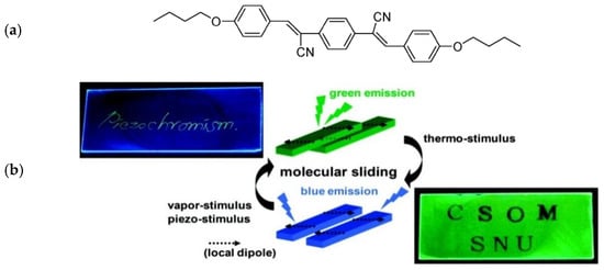 - Yoon, S.-J.; Chung, J.W.; Gierschner, J.; Kim, K.S.; Choi, M.-G.; Kim, D.; Park, S.Y. Multistimuli Two-Color Luminescence Switching via Different Slip-Stacking of Highly Fluorescent Molecular Sheets. J. Am. Chem. Soc. 2010, 132, 13675–13683. [Google Scholar] [CrossRef]