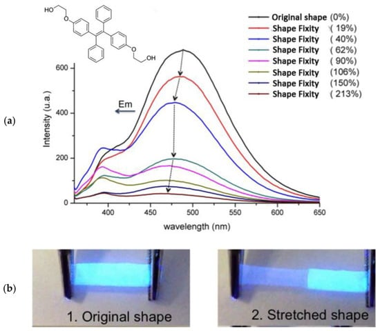 - Wu, Y.; Hu, J.; Huang, H.; Li, J.; Zhu, Y.; Tang, B.; Han, J.; Li, L. Memory chromic polyurethane with tetraphenylethylene. J. Polym. Sci. Part B Polym. Phys. 2014, 52, 104–110. [Google Scholar] [CrossRef]