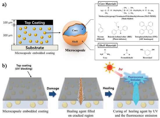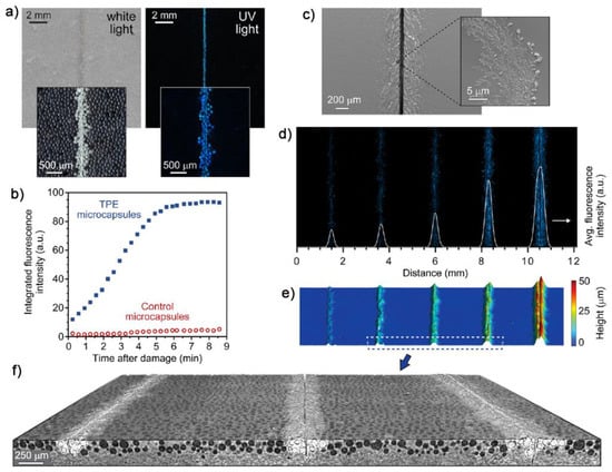 - Song, Y.K.; Kim, B.; Lee, T.H.; Kim, J.C.; Nam, J.H.; Noh, S.M.; Park, Y.I. Fluorescence Detection of Microcapsule-Type Self-Healing, Based on Aggregation-Induced Emission. Macromol. Rapid Commun. 2017, 38, 1600657. [Google Scholar] [CrossRef] [PubMed]