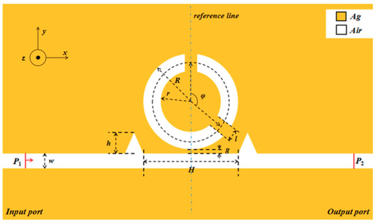 The schematic of the designed sensor is plotted in Figure 1. The structure comprised a MIM waveguide with two symmetric triangle stubs and a CSRRC. Since the thickness of the proposed structure was significantly longer than the light wavelength, the 2D model could be used to approximate the 3D model. As a result, the calculation was simplified and the problem of the computer workstation limitation was fixed. The white and yellow areas in the figure, respectively, represent air and silver. The relative dielectric constant of air is 1 (i.e., ). The relative dielectric constant of silver is defined by the Debye–Drude dispersion model [34]: