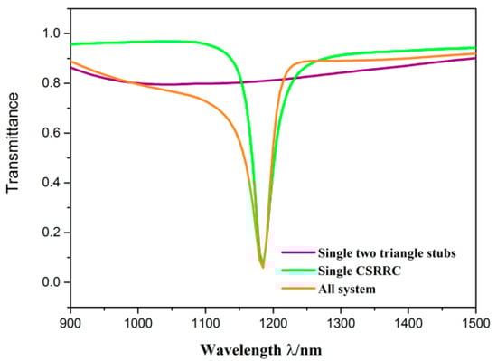 Transmission spectra of the single two symmetric triangle stubs (purple line), the single CSRRC (green line), and the sensor system (orange line).