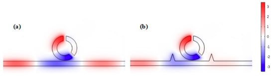 To understand the internal mechanism of Fano resonance more clearly, the normalized HZ field distributions of the single CSRRC structure and the whole system at the resonance dip (λ = 1185 nm) were studied. They are depicted in Figure 3a,b, respectively. From Figure 3b, it can be seen that the normalized HZ field distribution was only in the left part of the waveguide and the long part of the CSRRC, and a relatively strong resonance was formed in the CSRRC. In addition, the upper and bottom areas of the long part of the CSRRC were out of phase. However, there was normalized HZ field distribution in the right part of the waveguide in Figure 3a. The other area of the normalized HZ field distribution of the single CSRRC structure was similar to that of the whole system. It is to be noted that a stronger resonance exists in the CSRRC when the normal waveguide adds two symmetric triangle stubs, which can promote the formation of Fano resonance. Then, when the strong resonance is excited, the SPPs are almost confined within the CSRRC, which leads to a low transmittance at the dip. It is obvious in Figure 3b that the SPPs are, directly and indirectly, coupled to the waveguide and the CSRRC, respectively. Thus, they can be regarded as the continuous broadband state and the discrete narrowband state, respectively.