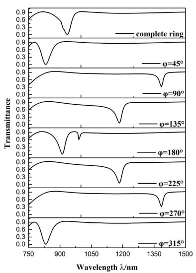 We then studied the eight similar structures, whose parameters were all the same as those in Figure 3, except the angle between the two splits of the CSRRC φ. Among them, seven structures included two splits, while one structure contained a complete ring as the comparison. We calculated the transmission spectra of the different structures, whose angle between the two splits was 45°, 90°, 135°, 180°, 225°, 270° and 315°, respectively. The transmission spectrum of the complete ring structure was also considered. As shown in Figure 4, there were differences between the transmittance spectra of these eight structures. As for the complete ring, φ = 45° and the φ = 315° side-coupled CSRRC structures, their transmittance spectra were the Lorentz shape curve, which had ultra-low transmittance at their dip (the complete ring was at λ = 935 nm while the other two structures were both at λ = 830 nm) and a broad FWHM. As for the φ = 90° and φ = 270° side-coupled CSRRC structures, their FMHW was relatively narrow, but they had high transmittance at the dip (λ = 1385 nm), which leads to difficulty in detecting signals. As for the φ = 135° and φ = 225° side-coupled CSRRC structures, as we analyzed previously, they showed a Fano resonance phenomenon and thus, had ultra-low transmittance at their dip (λ = 1185 nm) and relatively narrow FWHM. The ultra-low transmittance can lead to a larger extinction ratio, and the relatively narrow FWHM can lead to a high figure of merit (FOM) and better sensing resolution. As for the φ = 180° side-coupled CSRRC structure, there were two dips (one at 910 nm and the other at 990 nm) in the transmittance spectrum. The first dip (λ = 910 nm) had a relatively broad FWHM and low transmittance at the dip, while the second dip (λ = 990 nm) had a narrower FWHM and very high transmittance at the dip. In addition, the distance between these two dips was very close, thus they would interfere with each other’s detection. From the above comparison, it can be concluded that proper destruction of the symmetry of the structure can support Fano resonance, which has better sensing properties of high sensitivity alongside a better FOM. It was found that the transmission spectra of the φ = 45° and φ = 315° side-coupled CSRRC structure, the φ = 90° and φ = 270° side-coupled CSRRC structure, the φ = 135° and the φ = 225° side-coupled CSRRC structure were the same. This is because the complete ring structure was symmetrical about the reference line.