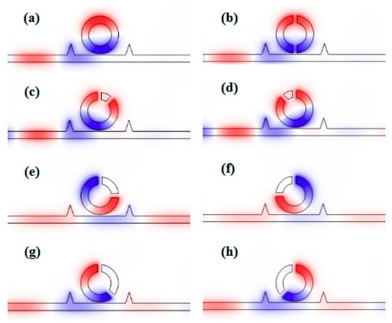 The HZ field distribution at the resonance dip of (a) the complete ring structure at λ = 935 nm; (b) φ = 180° side-coupled structure at λ = 910 nm; (c) φ = 45° side-coupled structure at λ = 830 nm; (d) φ = 315° side-coupled structure at λ = 830 nm; (e) φ = 90° side-coupled structure at λ = 1385 nm; (f) φ = 270° side-coupled structure at λ = 1385 nm; (g) φ = 135° side-coupled structure at λ = 1185 nm; (h) φ = 225° side-coupled structure at λ = 1185 nm.