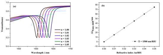 As shown in Figure 6b, when the variation of refractive indices changed, the wavelength shift of the dip altered linearly. As a result, this structure can serve as a refractive index sensor because it has the advantage of being more easily detected. The sensitivity of the sensor was obtained by linear fitting, which was 1500 nm/RIU with a FOM of 62.5. This is the best parameter for this structure.