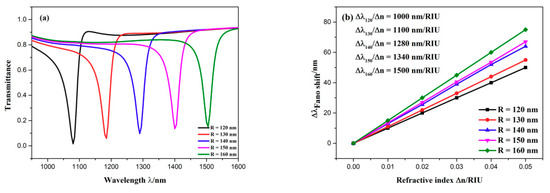 Firstly, the effects of the CSRRC outer radius on Fano resonance are discussed. The CSRRC outer radius R was adjusted from 120 to 160 nm for an interval of 10 nm, while other parameters remained unaltered. The transmission spectra are plotted in Figure 7a. As R increased, the dip position of Fano resonance showed an obvious redshift and the transmittance at the dip became a little higher. The simulation result indicates that the dip wavelength of Fano resonance was determined by R, which is a key parameter of the CSRRC. In other words, the wavelength of the dip relies on the CSRRC corresponding to the discrete narrowband state. By linear fitting, the different sensitivities of the various structures were obtained, as is shown in Figure 7b. It was found that sensitivity became better with the increase of the CSRRC outer radius R. Thus, it is necessary to make a compromise among device size, transmittance and sensitivity.