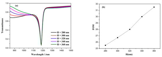 Successively, the influence of the distance between the two symmetrical triangle stubs H on the propagation characteristics was investigated. The distance between the two symmetric triangle stubs H was adjusted from 280 to 360 nm with intervals of 20 nm, while the other parameters remained invariable. As plotted in Figure 8a, the dip position of Fano resonance remained unchanged regardless of how H changed. When H increased, the transmittance of the dip slightly decreased and the FWHM of the transmission spectra became broader, which is displayed in Figure 8b. When the FWHM becomes smaller, a higher FOM and a better sensing resolution can be obtained. Thus, a smaller H should be applied to our sensor system. The distance between the two symmetric triangle stubs H is one of the significant parameters of the waveguide with two symmetric triangle stubs, which is considered as the continuous broadband state. Hence, it can be inferred from these calculation results that the continuous broadband state affects the lineshape of Fano resonance rather than its wavelength of the dip.