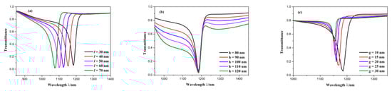To further study the influence of geometric parameters on transmission properties, we altered the length of the CSRRC splits l. The l was adjusted from 30 to 70 nm with intervals of 10 nm, and here, other parameters were kept constant. Their transmission spectra can be observed from Figure 9a. The dip position of Fano resonance produced a blueshift and the Fano lineshape remained unchanged as the length of the CSRRC splits l increased. Then, we kept other parameters constant except for increasing the height of triangle stub h from 80 to 120 nm, with intervals of 10 nm. The simulation results of the different heights of the triangle stubs are depicted in Figure 9b. It is found that the dip wavelength of Fano resonance did not shift and the Fano lineshape changed from a nearly symmetrical shape to a completely asymmetrical shape, while increasing the height of triangle stub h. Next, we increased the coupling distance from 10 to 30 nm with intervals of 5 nm and kept other parameters invariable. The transmission characteristics can be attained from Figure 9c. When the coupling distance g became larger, the Fano resonance dip showed a blueshift, the FWHM got narrower, and the transmittance of the Fano resonance dip became higher. This can be explained by the fact that the coupling strength becomes weaker with the increase of the coupling distance g. Based on the above analysis, it can be concluded that the parameters of the CSRRC can change the dip wavelength of Fano resonance, whereas the parameters of the waveguide with two symmetric triangle stubs can change the shape of transmittance spectrum. This is attributed to the stronger field energy restriction of the ring cavity rather than the waveguide, which is displayed in Figure 3b.