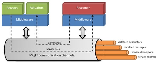 The overview of the communication platform is shown in Figure 2. The middleware layer relies on top of the MQTT protocol and, at the same time, provides the exposed functionalities to the upper modules such as sensors, actuators, and reasoning services.