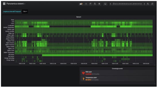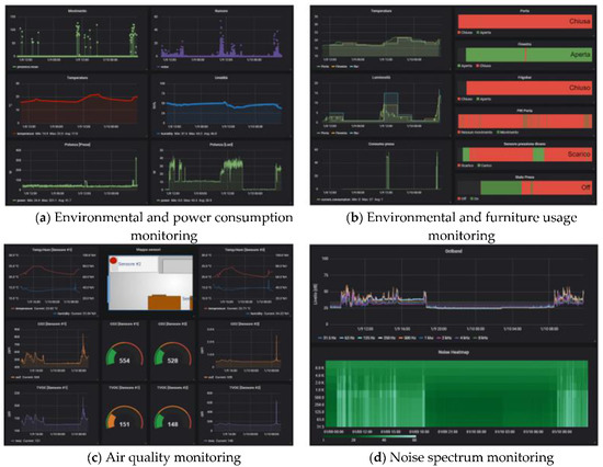 - The environmental sensor panels (Figure 5) report: Temperature, humidity, luminance, CO2 and total volatile organic compound (TVOC) levels, movement, noise frequency distribution, light/ground lines energy usage, state of the windows/doors, and presence of a person on the sofa or on the bed. These data are collected by means of different types of sensors and protocols, such as Zigbee and Z-Wave;