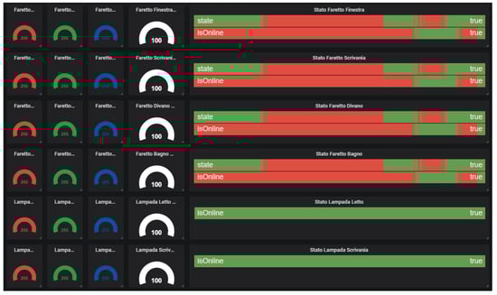 Figure 6. RGB light bulbs monitoring panel. - The localization systems’ (Figure 7) status, both for the inner cabin localization and the outer cabin proximity detection, respectively. The first system reports the estimated position of a person in one of the eight zones the room has been subdivided into. The second system reports the received signal strength of the Bluetooth beacons emitted by the bracelet worn by the passenger. This information is useful to detect when the passenger leaves or approaches the cabin in order to trigger specific actions (e.g., power saving policies).
