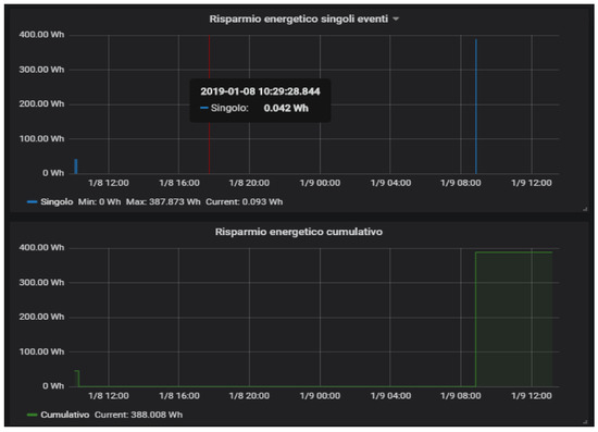 An example of the reasoner application is the power saving scenario. Exploiting the information generated by the cabin sensors, the reasoner is able to detect when nobody is in the cabin and, therefore, a power saving policy is applied by shutting down all the allowed appliances and lights within the cabin. When the passenger comes back to his cabin, the reasoner detects this situation and subsequently turns on all the devices that have been previously switched off. The tests performed with the experimental setup showed that the system was always able to restore the previous cabin state in a few seconds before the user reached the cabin door. Every time the power saving scenario is triggered, an estimate of the saved energy is computed and reported in the panels shown in Figure 8. These panels report both the single event and the cumulative saved energy.