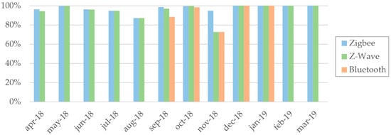 Another monitored aspect is the availability of the technologies installed in the cabin. The plot shown in Figure 10 represents the availability of each technology used in the experimental cabin, by month, during the test period. Table 2 reports the details of the availability data comprising the averages computed by month and by technology.