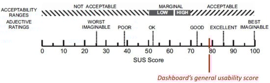 The dashboard’s general usability measured a 77.95 (SD = 25.70) score, a SUS result indicating that the dashboard has been evaluated as adequately usable, in spite of the large variability of the data, as one participant scored 50 and two participants scored 97.5 (Figure 11). This clearly indicates that not all participants had a clear understanding regarding the use of the dashboard; thus, this helps us for further investigation on aspects to be improved.