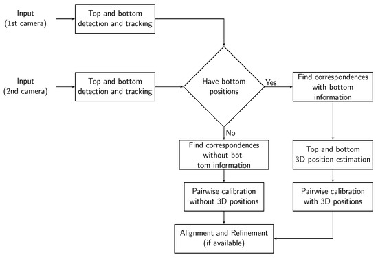 Figure 1 shows the block diagram of the proposed framework of multi-camera calibration based on walking pedestrians. First, the proposed method calibrates all the cameras in the network in a pairwise fashion. Then, if the ground truth measurements are available (at least 3 points), we can apply the refinement and alignment to further optimize the extrinsic parameters. If the bottom of the pedestrians cannot be observed, we apply the novel method to estimate the extrinsic parameters based on just the top and the centerline of the walking person (Section 3.5). However, if the bottom of the pedestrians can be observed properly, we apply the extrinsic calibration method based on the top and the bottom that extracted from OpenPose [16] to have more accurate extrinsic parameters.