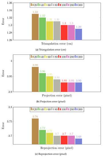 The calibration results on Camera Network 1 (CN1) within 1000 experiments of the proposed method. , , , and denotes the triangulation error, projection error, reprojection error, and relative reprojection error, respectively.
