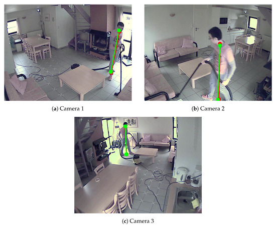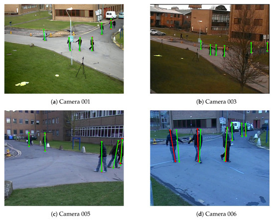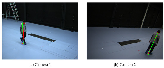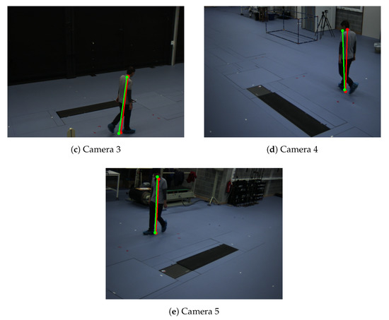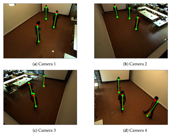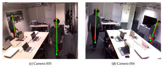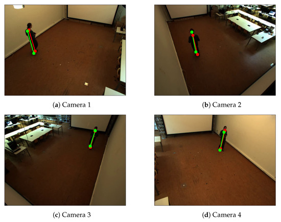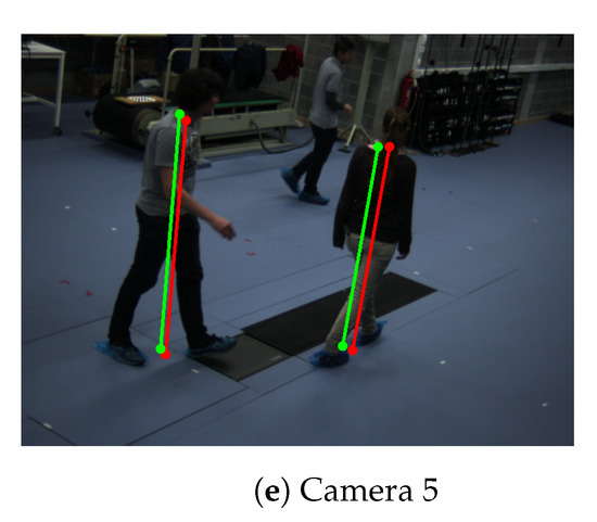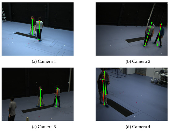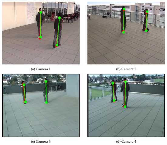 Example of detected the bottom and top positions of the pedestrians of Camera Network 3—EPFL-Terrace dataset [37]. Red color represents detected positions by the human pose estimation method. Green color represents the detected reprojected positions.