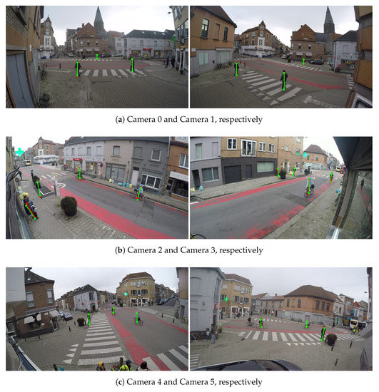 Example of detected the bottom and top positions of the pedestrians of Camera network 5—multiple pedestrians at an intersection. Red color represents detected positions by the human pose estimation method. Green color represents the detected reprojected positions.