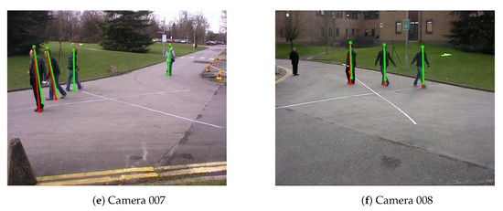 Example of detected the bottom and top positions of the pedestrians of Camera Network 6—PETS2009-S2L1 dataset. Red color represents detected positions by the human pose estimation method. Green color represents the detected reprojected positions.