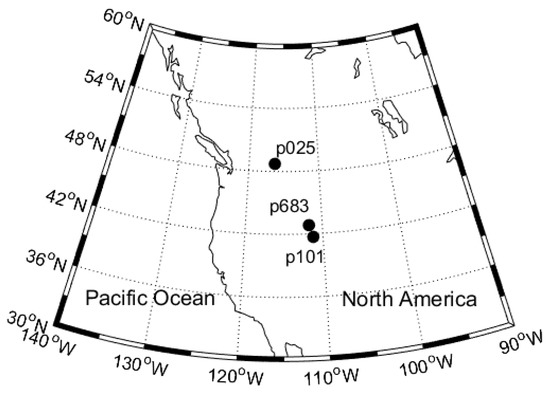 Three selected Global Positioning System (GPS) sites of the Plate Boundary Observatory (PBO) network in the western United States.