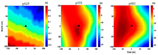 Digital elevation models (DEMs) for the selected GPS sites of p025, p101, and p683, black triangles denoting the location of GPS sites (the value at the center of DEM diagram is 0 m [27]).