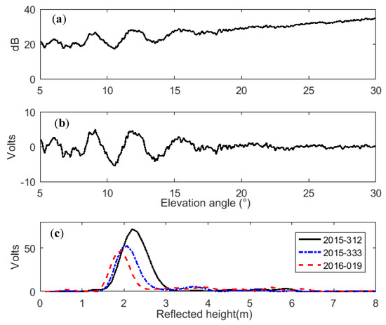 where is the reflection phase. The SNR is a function of signal wavelength, elevation angle of a satellite, and the GPS antenna height above the reflecting surface. It is mainly determined by the antenna gain pattern and by the satellite transmitted power [16]. Previous studies showed that the effects of antenna gain pattern dictate that Pr << Pd, which means the multipath contribution to SNR is small in magnitude/power but oscillatory, while Pd is large in magnitude/power but goes through a complete cycle only once over a satellite pass (Figure 3a) [13]. For GPS multipath reflectometry applications, the trends in the SNR are not of interest and can be removed. After the trend power (Pd, Pr) is removed using a low-order polynomial, the simplified SNR multipath pattern can be described as [16]: