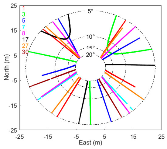 For GPS multipath applications and studies, it is helpful to display the distribution of multipath reflected points around the GPS antenna. Figure 4 shows the specular reflected point tracks of L2C signals for eight GPS satellites tracked at site p025. As previous studies indicated [13], reflected point tracks extended from 5° to 20° are used to estimate the powers and frequencies of the multipath modulations. It should be noted that the specular reflected point tracks were obtained in an ideal case, while the actual reflected areas can be presented by means of GPS footprint derived from the First Fresnel Zone (FFZ) [36].