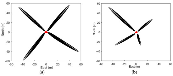(a) First Fresnel Zone (FFZ) of satellite 7 (southwest and southeast) and satellite 8 (northwest and northeast) at p025 on a flat surface on DOY 2015-312; (b) FFZ of satellite 26 at p101 on a slope on DOY 2015-356, with the surface slopes of 14% (northeast), 0% (northwest), 7% (southeast), and 18% (southwest). All slopes went down from the antenna. Locations of GPS sites are shown with red triangles.