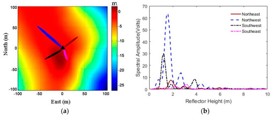GPS footprints and Lomb–Scargle periodogram (LSP) curves for satellite 8 at GPS site p101 on DOY 2015-356. (a) Distribution of the GPS signal footprints of FFZ in different directions, with GPS site location shown in a black triangle; (b) LSP curves of each SNR data. Brown, blue, black, and pink lines represent GPS reflected signals in the directions of northeast, northwest, southwest, and southeast, respectively.