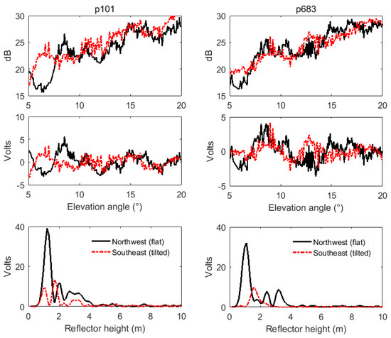Figure 6a shows the distribution of GPS signal footprints of FFZ at site p101 in different directions. The footprints with brown, blue, black, and pink are for the directions of northeast, northwest, southwest, and southeast, respectively, which had the surface slopes of 14%, 0%, 7%, and 18%, respectively. Figure 6b shows their LSP curves derived from detrended SNR data. It shows that the SNR amplitude for a flat area was significantly stronger than those for tilted areas. With slope increasing, the amplitude of the LSP curve became smaller, and even unrecognizable when the slope reached 18%. Furthermore, Figure 7 shows the original SNR time series, detrended SNR time series, and reflected heights from LSP curves at PBO GPS sites p101 (left) and p683 (right) on a flat area (northwest direction) and tilted area (southeast direction), respectively. We can also see that the oscillations of the SNR time series on flat areas were more obvious than those on tilted areas, and especially the amplitudes of LSP curves on flat areas were larger than those on tilted areas. It is clear that for GPS sites located on a slope, the reflected signals will be scattered and the power will be greatly reduced due to the angles and orientations of tilted areas. For the snow depth determination with the GPS-IR, it is necessary to find a flat area around the GPS site located on the tilted ground surface.