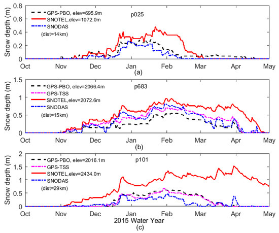Snow depth time series derived with the GPS-PBO, GPS-TSS, SNOTEL, and Snow Data Assimilation System (SNODAS) during water year 2015 for p025 (a), p683 (b), and p101 (c).