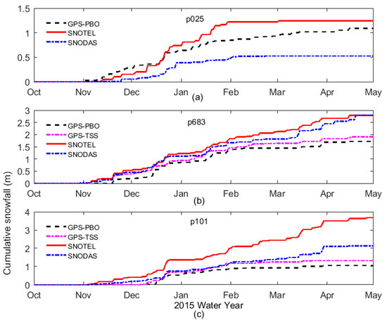 Time series of cumulative snowfall computed with GPS-PBO, GPS-TSS, SNOTEL, and SNODAS during water year 2015 for p025 (a), p683 (b), and p101 (c).