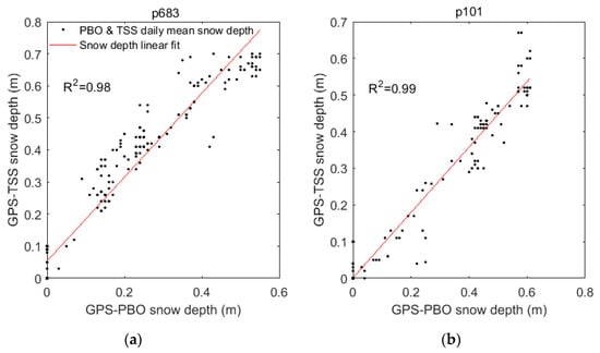 Comparison of snow depth estimations derived with GPS-PBO and GPS-TSS at p683 (a) and p101 (b). Black dots and red lines represent the daily mean snow depth derived from the GPS-PBO method and GPS-TSS method, and snow depth linear fit, respectively.