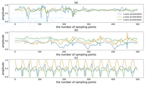 Illustration of triaxial acceleration of three kinds of sports: (a) the waveform of playing badminton, (b) the waveform of swimming, and (c) the waveform of running.