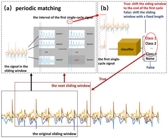 For the weakly periodic activity, although the movement period under the same or different motion states varies greatly (as shown in Figure 5), the period remains the same between several adjacent movements. From this characteristic, we propose a detection and recognition method based on periodic matching. The flowchart is shown in Figure 5. First, the sliding window obtains a fixed-length signal from the original input signal. Second, the first single-cycle signal from the input is detected by using periodic matching, as illustrated in Figure 5a. Third, a classifier is used to recognize the detected signal. If it is recognized as a certain motion state, the result of periodic matching is true; otherwise, it is false. Then, the different results are used to set different step sizes to get the next sliding windows as the new input, and steps 1–3 are repeated until the end of the original signal. Since this process requires the assistance of classification, it is called classification-based periodic matching. Finally, all the detected single-cycle signals are fed as input to a classifier to identify their motion states. In the experiment, five machine learning methods that have been successfully used in activity recognition were considered classifiers: CNN, k-nearest neighbor (KNN) [30], naive Bayes (NB) [31], random forest (RF) [32], and support vector machine (SVM) [33].