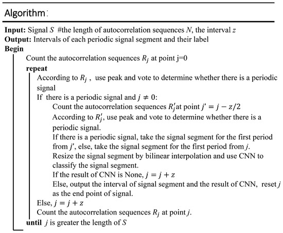 To ensure correct periodic matching and segmentation, we combined the classification method to apply some adjustments to the periodic matching results. In general, when no periodic signal is detected, periodic matching is executed every other time gap z (generally set to the minimum period length of the target action). When a periodic signal is detected, it is shifted forward by z/2 lengths, and periodic matching is repeated to ensure that the obtained periodic signal spans from the beginning of the motion state to its end. As illustrated in Figure 5, if it is classified as a specific target motion state, then the next period matching starts from the end of the current period, which is framed by a red dotted box. Otherwise, it starts from the position that is z points after the start of the current period, which is framed by a yellow dotted box. The specific algorithm is shown in Figure 6.