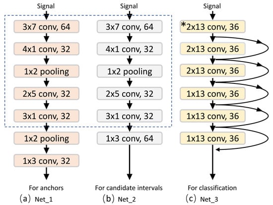 - As mentioned above, a set of anchors of different sizes are set in the center of the receptive field corresponding to each feature. For the alignment, the length of the input signal must be an integer multiple of the stride of the CNN output with respect to the input signal. On this basis, we set the input signal to a multiple of 4 (the stride of Net_1, which is used for interval generation) by adding zero to the end of it. Let be the length of the original signal; the number of zeros added (denoted by ) can be obtained by the following calculation: . Therefore, our CNN can process the input of any length.