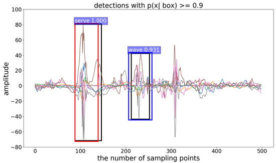 Visualization of the results. The black boxes are the real interval, the red box is the predicted interval of “serving”, and the blue box is the predicted interval of “swinging”. Their confidence levels are marked in the upper left corner.