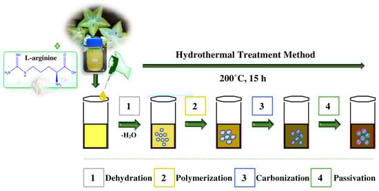 The formation mechanism of AC-NCDs is related to hydrothermal treatment conditions. The possible formation mechanism of AC-NCDs was illustrated in Figure 2. Several processes were involved in the formation of AC-NCDs during hydrothermal treatment including dehydration, polymerization, carbonization, and passivation [26,27,28,29]. Firstly, the –COOH, –C=O, –OH, and –NH2 groups presenting in AC fruit extract and Arg may react together, facilitating dehydration and carbonization process in elevated temperature. The continuous intermolecular dehydrationhappened during the hydrothermal process, inducing the shrinkage of polymer nanoparticles. The aromatic clusters were simultaneously produced inside the polymers and some C=C and C=N bonds form at this stage. The dehydration and polymerization will occur between the molecules through a well-known amidation reaction. Then, O atoms were substituted by N atoms to form amides inducing a newly formed surface state. A burst in the nucleation of NCDs takes place when the aromatic cluster concentration in the polymers reaches the critical supersaturation point. The resulting peptide chains were further carbonized with increasing NCDs particles through prolonged reaction time and then the polymeric fragments vanished. In the hydrothermal process, the surface passivation facilitates a high radiative recombination yield. As a result, a higher N content can increase the fluorescence QY and emission intensity of the CDs.