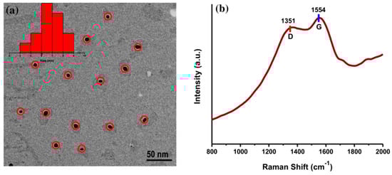 The surface morphology of AC-NCDs was captured by a TEM microscope. The TEM image of AC-NCDs with spherical shape and evenly distributed over the carbon-coated Cu grid was shown in Figure 3a. The size distribution of AC-NCDs was ranging from 4 to 9 with an average size of 6.67 nm. Besides, the Raman spectrum of AC-NCDs (Figure 3b) showed the disordered D band at ~1351 cm−1 and the crystalline G band at ~1554 cm−1 associated with the sp3- and sp2-carbon moieties in the AC-NCDs, respectively. The relative band intensity ratio (ID/IG) is a key parameter to predict the graphitization degree of carbon nanomaterials [30]. The ID/IG value of AC-NCDs was found to be 1.6 (in general, ID/IG is higher than 1 for well amorphous carbon), which indicates a low degree of graphitic order, sufficient major surface defects, and plenty of surface functional groups [31]. A high degree of defect formed by nitrogenation and oxygenation processes during synthesis partially destroys the graphitic structure of AC-NCDs [32,33]. Therefore, this Raman spectrum proved that the AC-NCDs have an amorphous structure and not graphene quantum dots.