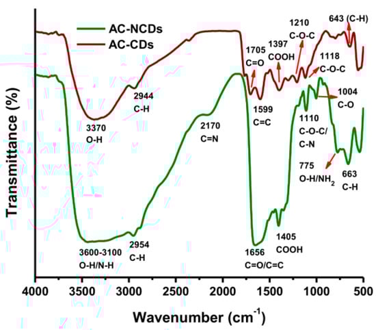 Furthermore, the functional groups of CDs were measured by FTIR spectroscopy. The FTIR spectra of AC-CDs (dark red line) and AC-NCDs (green line) were given in Figure 4. The FTIR spectrum of AC-CDs exhibited absorption bands at 3370, 2944, 1705, 1599, and 1397 cm−1, which conforms to the O–H, C–H, C=O, C=C, and –COOH stretching vibrations, respectively [22,34,35]. AC-CDs also exhibited the stretching vibration bands at 1210/1118 and 643 cm−1, corresponding to C–O–C and C–H bonds, respectively [36,37]. These functional groups were slightly shifted, decreased, and broadened in the FTIR spectrum of AC-NCDs due to the influence of carbonyl groups [37]. In the FTIR spectrum of AC-NCDs, the O–H stretching vibrations broadened ranging from 3600 to 3100 cm−1, which reveals that the CDs were doped by N-dopant from Arg [38]. The stretching vibrations of C–H groups shifted from 2944 to 2954 cm−1. The wide absorption bands of AC-NCDs centered at 1656 cm−1 were associated with C=O/C=C bonds [39,40]. The bands at 2170 and 1004 cm−1 were correlated to the stretching vibrations of C=N and C–O bonds, respectively [41,42]. The stretching vibrations of –COOH groups shifted from 1397 to 1405 cm−1. The band at 1110 cm−1 was identified as C–N and C–O–C stretching vibrations [38]. The other peaks at 775 and 663 cm−1 were identified as O–H stretching/NH2 wagging vibrations and C–H stretching vibrations, respectively [40,43].