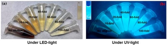 The appearance of AC-NCDs with various dilution factors under irradiation of (a) LED-light and (b) UV-light.