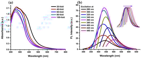 (a) UV-Vis absorption spectra of AC-NCDs with various dilution factors and (b) fluorescence emission spectra of AC-NCDs at excitation wavelengths of 280–440 nm with 20 nm increment (Inset: normalized fluorescence emission spectra).