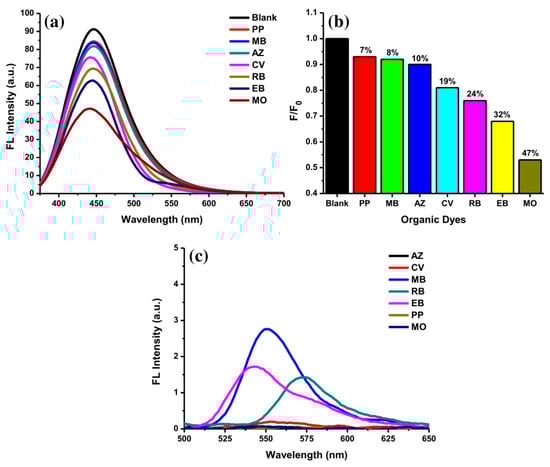 The selectivity of AC-NCDs for several ODs was evaluated at pH 5. Figure 8a showed fluorescence spectra of AC-NCDs after adding with several ODs including PP, MB, AZ, CV, RB, EB, and MO (50 μM). The fluorescence emission peak of AC-NCDs was centered on a specific wavelength after interacting with the ODs. The emission peak center of AC-NCDs at 446 nm was maintained after interacting with PP, MB, AZ, and RB. The emission peak center of AC-NCDs was shifted from 446 nm to 444 nm, 441 nm, and 440 nm after interacting with EB, CV, and MO, respectively. The largest shift of emission peak center was occurred by MO. Therefore, this characteristic is also one of the marks for the MO interaction to AC-NCDs. Almost all ODs quenched the fluorescence intensity of AC-NCDs with different quenching percentages. Figure 8b shows the fluorescence quenching efficiency for MO (47%) which is higher than EB (32%), RB (24%), CV(19%), AZ (10%), MB (8%), and PP (7%), leading to the highest selectivity of AC-NCDs for MO. The individual fluorescence emission peak of ODs without interacting with AC-NCDs was also recorded at the excitation wavelength of 360 nm (Figure 8c). As compared to other ODs, only MB, EB, and RB showed their very weak emission peaks with the emission wavelength of 550, 545, and 470 nm, respectively. Because of very weak emission peaks derived from MB, EB, and RB, and no emission peaks derived from PP, CV, AZ, and MO, so that there was no other fluorescence peak showed after interacting ODs with AC-NCDs except at 440 nm, which corresponds to AC-NCDs’ character. So, the fluorescence quenching of AC-NCDs after interacting with MO is the most important behavior for probing MO.