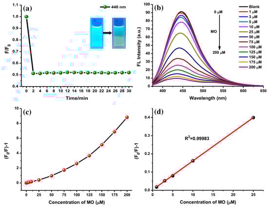 (a) Incubation time for the AC-NCDs/MO interaction on the fluorescence behavior (Inset: AC-NCDs’ and AC-NCDs/MO’ solutions under UV-light irradiation), (b) fluorescence emission spectra of AC-NCDs’ solution in the existence of various MO concentrations (360 nm excitation wavelength 360 nm, 3 min interaction time), (c) plots of (F0/F)-1 values of AC-NCDs’ solution in the presence of various MO concentrations (0–200 μM), and (d) the relationship between the fluorescence quenching and MO concentrations of 1 to 25 μM.