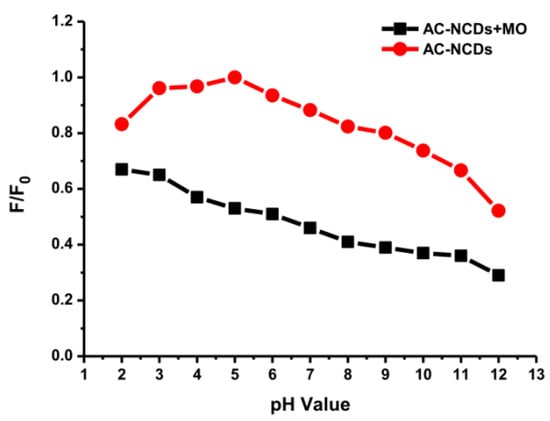 Fluorescence intensity of AC-NCDs and AC-NCDs/MO system with different pH values.
