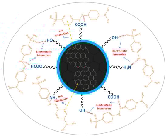 The pH values present a significant role in the interaction process, influencing not only the surface charge of AC-NCDs and dissociation of surface functional groups of AC-NCDs but also the chemical speciation of MO molecules [57]. The effect of pH values from 2 to 12 on the interaction of AC-NCDs and MO to investigate further quenching efficiency was shown in Figure 10. The optimal interaction was achieved at pH 5 due to the highest quenching efficiency of AC-NCDs after interacting with MO due to electrostatic interaction [58]. The lower interaction of AC-NCDs and MO was because of H+ and OH- interruptions in strong acid and alkaline conditions. MO has two different chemical structures with quinone or azo bond chromophores, depending on the solution pH [59]. MO occurs as a quinone form in acid conditions and converts into an azo structure in alkaline conditions [60]. The MO quinone form has two major active positions, –S=O and –NH– groups. The surface of AC-NCDs has low positive or low negative charge under acidic conditions (Figure S4), increasing the electrostatic interaction to the –S=O groups and/or to the –NH– groups of MO. In the –S=O groups the hydrogen bonding acceptor interacts with –OH groups on the surface of AC-NCDs, while in the –NH– groups of MO the hydrogen bonding donor interacts with the –COOH groups or –NH2 groups on AC-NCDs. Besides, π–π interactions between C=C or benzene rings of MO in both azo and quinone type structures and bulk π-systems of AC-NCDs also play a slight role in the interaction [61]. A schematic of the plausible interactions between AC-NCDs and MO is illustrated in Figure 11.